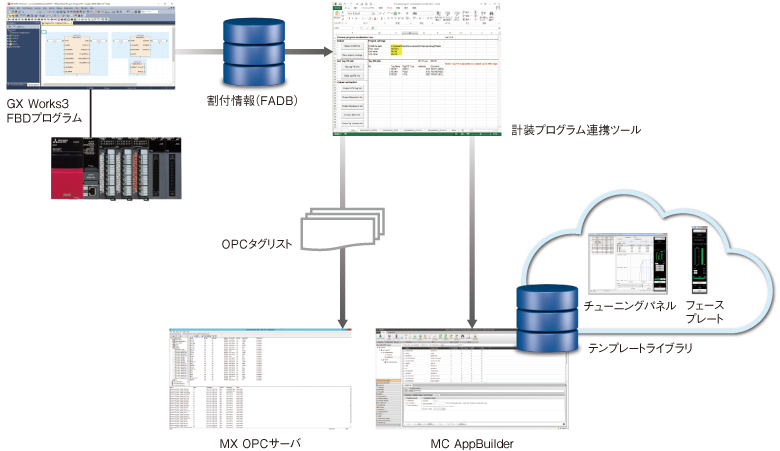 MC AppBuilder can easily generate faceplate templates and device / tag assignment information for OPC servers in cooperation with GX Works3 and PX Developer, contributing to a reduction in man-hours.