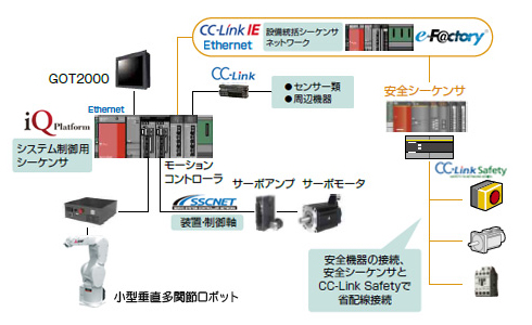 iQ Platform strengthens cooperation between PLC, GOT and robot. Optimal implementation of system operation and visualization. Achieves efficient production management with various networks and MES interfaces.