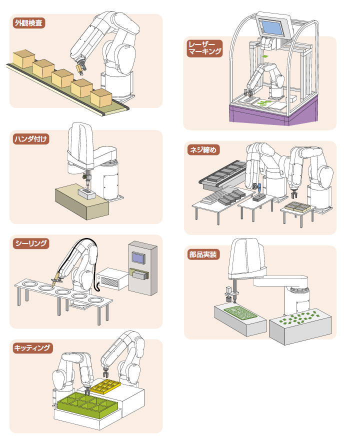 High-speed parts kitting by a horizontal articulated robot, skillful assembly work by a vertical articulated robot, and high-performance hands (multi-hand, electric hand) compatible with various works.