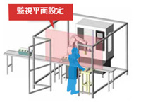 - When the safety fence is opened, the robot continues to operate at low speed inside the surveillance plane. Workers can perform inspection work inside the safety fence and outside the monitoring plane