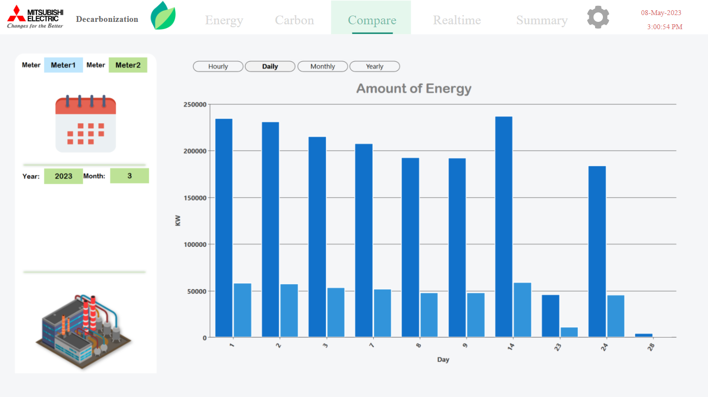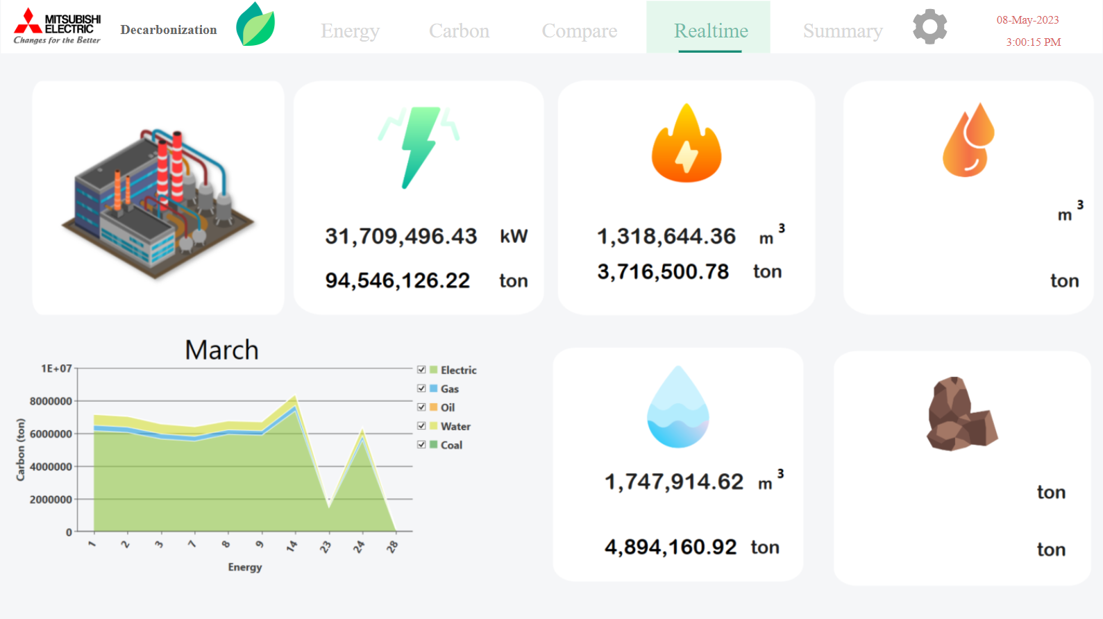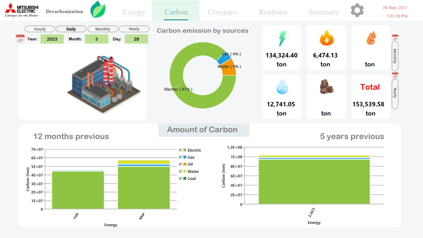 SCADA GENESIS64™ มีฟังก์ชั่นต่างๆ บนเทมเพลตที่ผู้ประกอบการสามารถใช้งานได้แบบง่ายๆ แม้ในโรงงานจะมีการใช้พลังงานจากหลายแหล่ง อาทิ ไฟฟ้า ก๊าซ แสงอาทิตย์ น้ำ หรือ ลม ระบบก็จะแยกสัดส่วนให้เห็นอย่างชัดเจนว่า พลังงานประเภทไหนมีอัตราการใช้เท่าไหร่ โรงงานใช้พลังงานส่วนไหนมากสุด ซึ่งจะถูกแปรได้ว่าพลังงานชนิดนั้นปล่อยก๊าซเรือนกระจกออกมามากที่สุด เช่น ถูกปล่อยออกมาจากการใช้ไฟฟ้ามากที่สุด ผู้ประกอบการจะทำการลดการใช้พลังงานไฟฟ้าลงหรือเปล่า เพื่อลดการปล่อยปริมาณคาร์บอนจากไฟฟ้า นอกจากจะดูเป็นรายชั่วโมง รายวัน รายเดือน รายปี ยังมีช่องเปรียบเทียบจำนวนปริมาณคาร์บอน 12 เดือนย้อนหลัง 1 ปีย้อนหลัง หรือ 5 ปีที่ผ่านมาว่าเป็นอย่างไร เพื่อประสิทธิภาพในการปรับปรุงระบบการผลิต