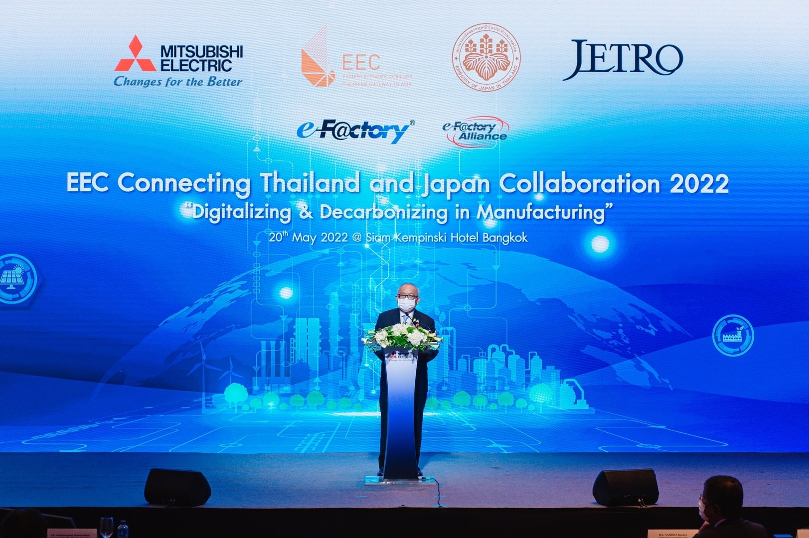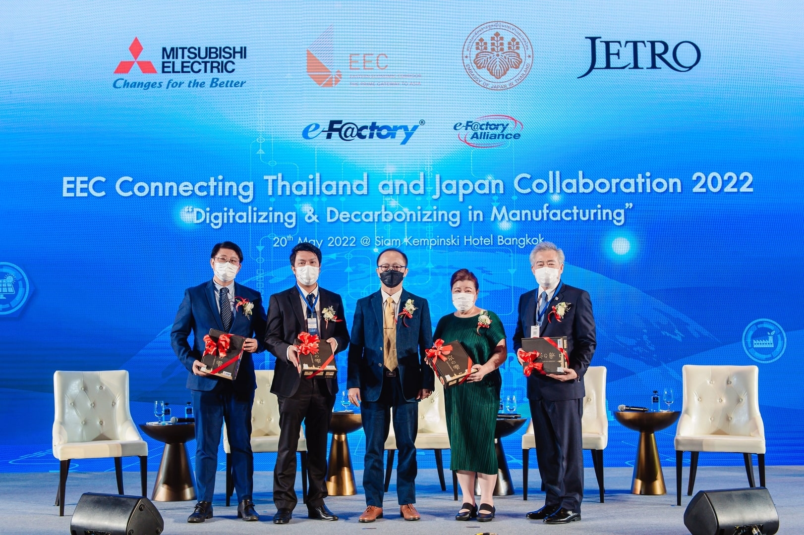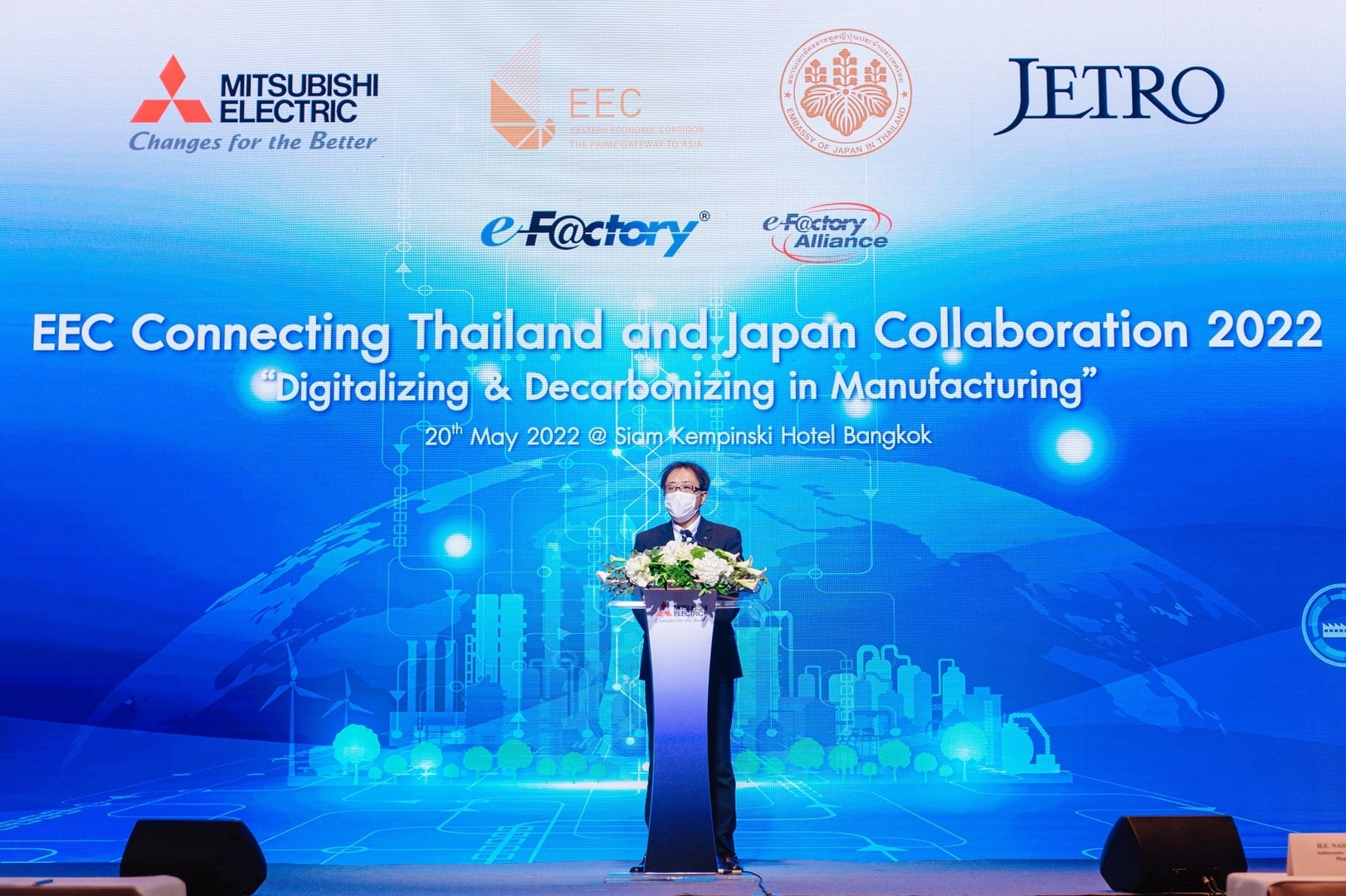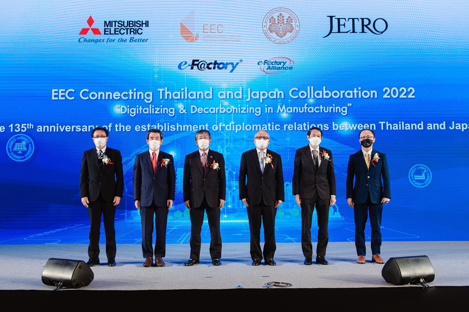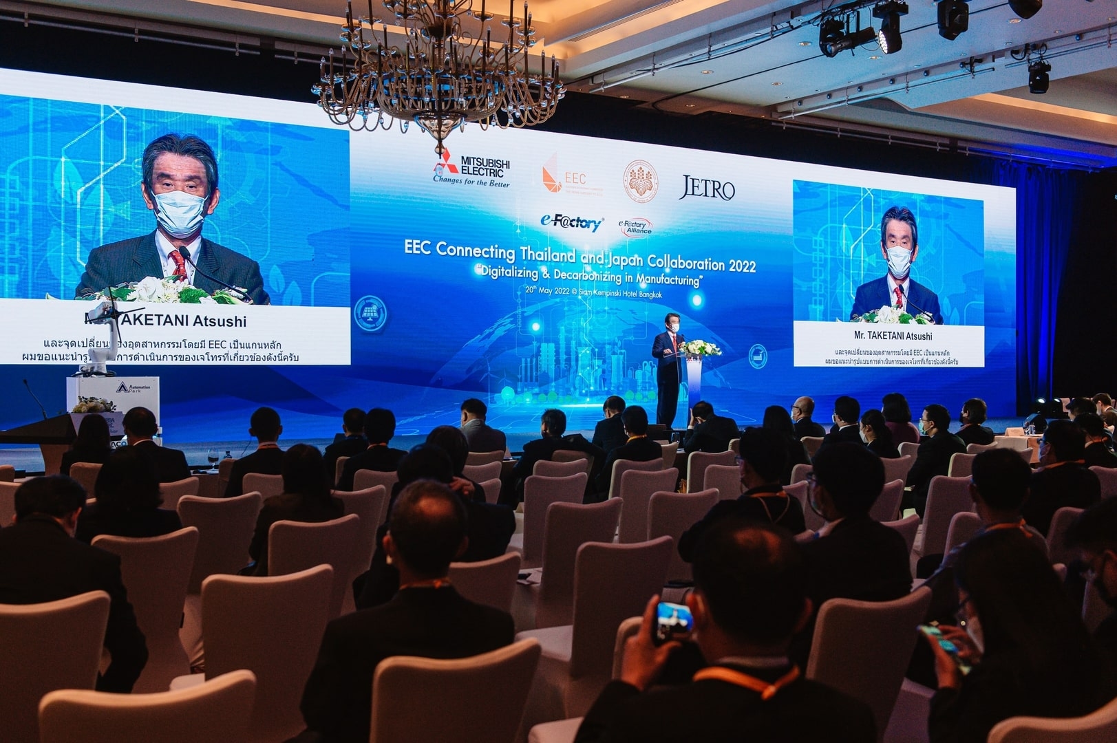 Mitsubishi Electric ร่วมกับ อีอีซี พร้อมทั้งพันธมิตรเครือข่าย Ecosystem ไทย-ญี่ปุ่น จัดงาน EEC Connecting Thailand and Japan Collaboration 2022 แถลงความสำเร็จจากการต่อยอดความร่วมมือเชื่อมโยงพันธมิตรกว่า 60 บริษัทในไทย และมากกว่า 1,000 บริษัททั่วโลก ถ่ายทอดความรู้และเทคโนโลยีชั้นสูง รวมทั้งแชร์ประสบการณ์จริงจากการใช้งาน เพื่อปลดล็อกภาคอุตสาหกรรมการผลิตของไทยให้เข้าสู่ระบบการผลิตอัตโนมัติ e-F@ctory (Industry 4.0 + 5G utilization) เดินหน้าพัฒนาสู่โรงงานอัจฉริยะกว่า 10,000 แห่ง พัฒนาทักษะบุคลากร 50,000 คน เกิดการลงทุนไม่น้อยกว่า 50,000 ล้านบาทใน 3 ปี ยกระดับอีอีซี สู่พื้นที่ลงทุนนวัตกรรมขั้นสูง เสริมความแข็งแกร่งทางเศรษฐกิจ เพิ่มรายได้ และคุณภาพชีวิตคนไทย พร้อมตั้งเป้าก้าวสู่ความเป็นกลางทางคาร์บอน Digitalizing and Decarbonizing เพื่อให้ธุรกิจเกิดการพัฒนาอย่างยั่งยืน และบรรลุเป้าความสำเร็จเชิงรูปธรรมตามนโยบาย Industry Thailand 4.0 ของรัฐบาลไทยได้เร็วขึ้น โดยมีบุคคลสำคัญทั้งจากภาครัฐและเอกชนเข้าร่วมงาน และออนไลน์รวมกว่า 500 ราย
