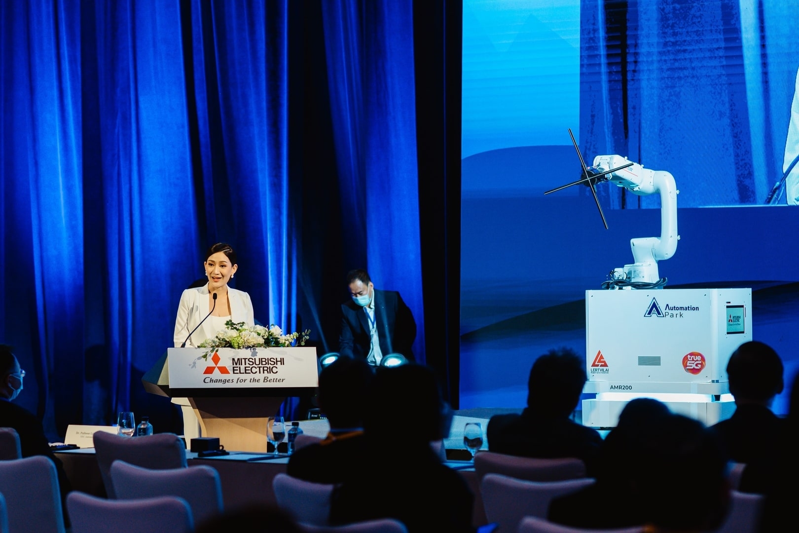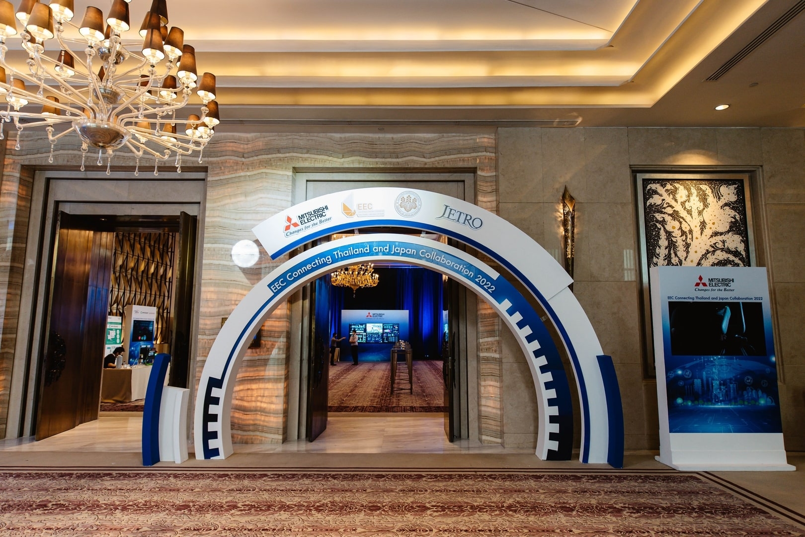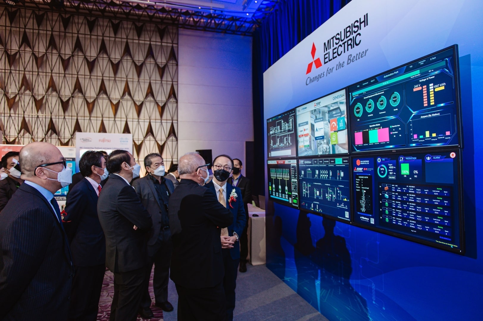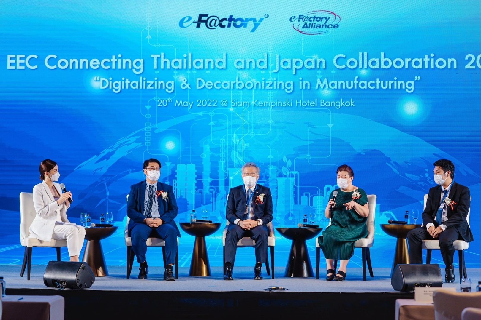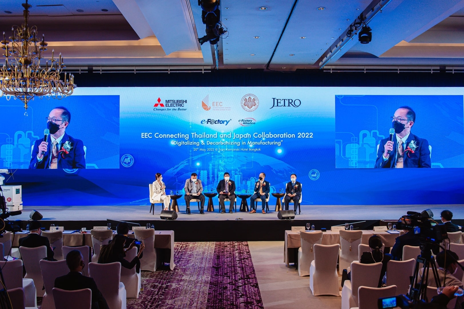 Mitsubishi Electric ร่วมกับ อีอีซี พร้อมทั้งพันธมิตรเครือข่าย Ecosystem ไทย-ญี่ปุ่น จัดงาน EEC Connecting Thailand and Japan Collaboration 2022 แถลงความสำเร็จจากการต่อยอดความร่วมมือเชื่อมโยงพันธมิตรกว่า 60 บริษัทในไทย และมากกว่า 1,000 บริษัททั่วโลก ถ่ายทอดความรู้และเทคโนโลยีชั้นสูง รวมทั้งแชร์ประสบการณ์จริงจากการใช้งาน เพื่อปลดล็อกภาคอุตสาหกรรมการผลิตของไทยให้เข้าสู่ระบบการผลิตอัตโนมัติ e-F@ctory (Industry 4.0 + 5G utilization) เดินหน้าพัฒนาสู่โรงงานอัจฉริยะกว่า 10,000 แห่ง พัฒนาทักษะบุคลากร 50,000 คน เกิดการลงทุนไม่น้อยกว่า 50,000 ล้านบาทใน 3 ปี ยกระดับอีอีซี สู่พื้นที่ลงทุนนวัตกรรมขั้นสูง เสริมความแข็งแกร่งทางเศรษฐกิจ เพิ่มรายได้ และคุณภาพชีวิตคนไทย พร้อมตั้งเป้าก้าวสู่ความเป็นกลางทางคาร์บอน Digitalizing and Decarbonizing เพื่อให้ธุรกิจเกิดการพัฒนาอย่างยั่งยืน และบรรลุเป้าความสำเร็จเชิงรูปธรรมตามนโยบาย Industry Thailand 4.0 ของรัฐบาลไทยได้เร็วขึ้น โดยมีบุคคลสำคัญทั้งจากภาครัฐและเอกชนเข้าร่วมงาน และออนไลน์รวมกว่า 500 ราย