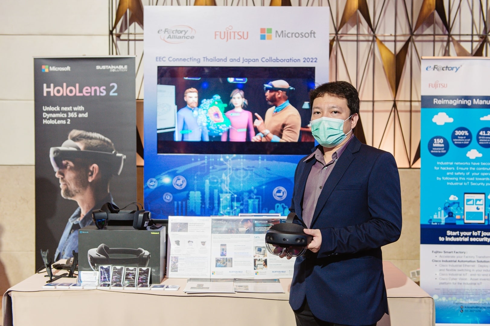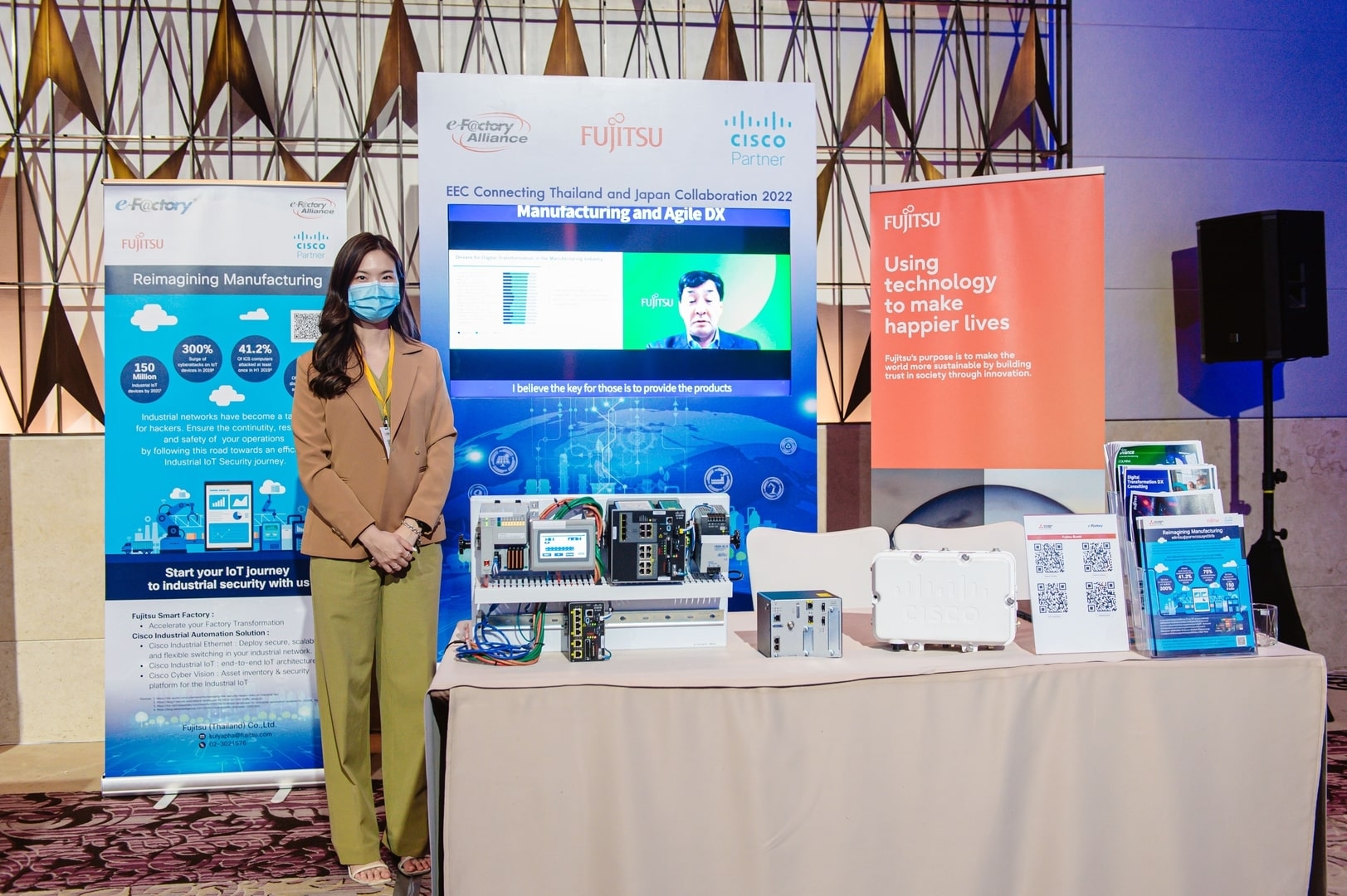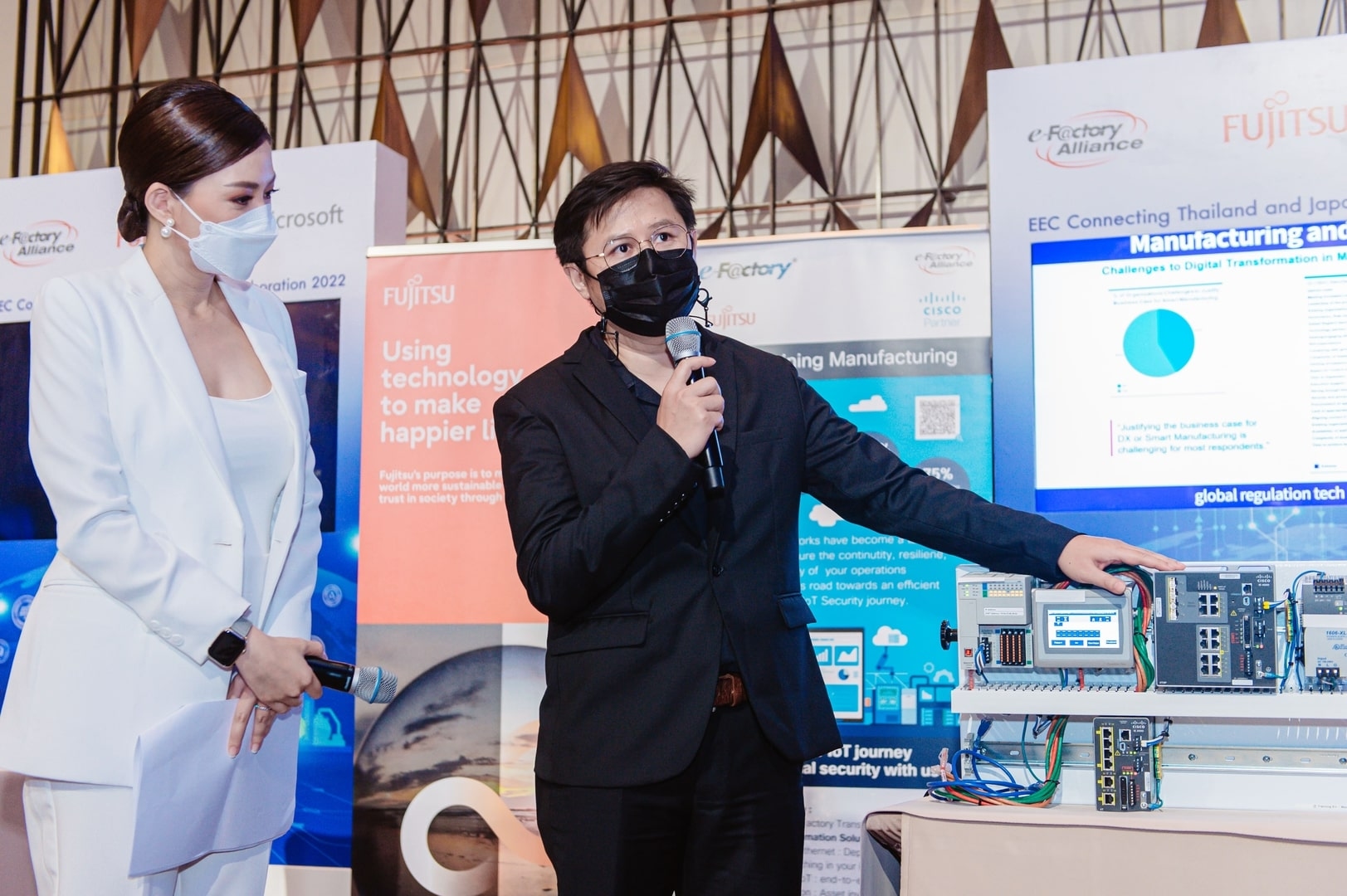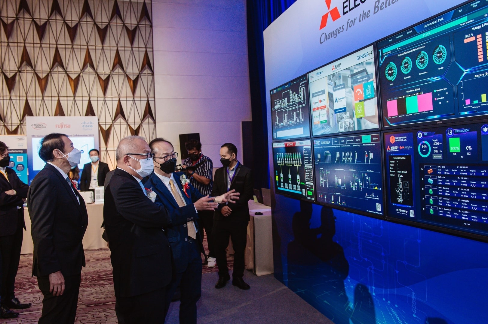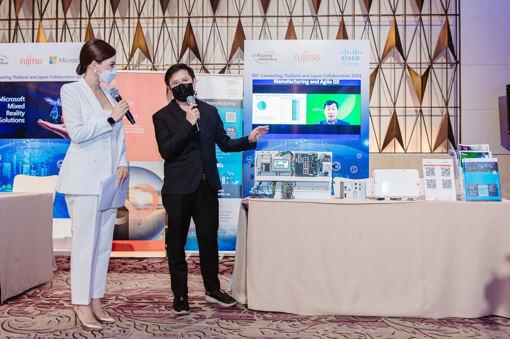 Mitsubishi Electric ร่วมกับ อีอีซี พร้อมทั้งพันธมิตรเครือข่าย Ecosystem ไทย-ญี่ปุ่น จัดงาน EEC Connecting Thailand and Japan Collaboration 2022 แถลงความสำเร็จจากการต่อยอดความร่วมมือเชื่อมโยงพันธมิตรกว่า 60 บริษัทในไทย และมากกว่า 1,000 บริษัททั่วโลก ถ่ายทอดความรู้และเทคโนโลยีชั้นสูง รวมทั้งแชร์ประสบการณ์จริงจากการใช้งาน เพื่อปลดล็อกภาคอุตสาหกรรมการผลิตของไทยให้เข้าสู่ระบบการผลิตอัตโนมัติ e-F@ctory (Industry 4.0 + 5G utilization) เดินหน้าพัฒนาสู่โรงงานอัจฉริยะกว่า 10,000 แห่ง พัฒนาทักษะบุคลากร 50,000 คน เกิดการลงทุนไม่น้อยกว่า 50,000 ล้านบาทใน 3 ปี ยกระดับอีอีซี สู่พื้นที่ลงทุนนวัตกรรมขั้นสูง เสริมความแข็งแกร่งทางเศรษฐกิจ เพิ่มรายได้ และคุณภาพชีวิตคนไทย พร้อมตั้งเป้าก้าวสู่ความเป็นกลางทางคาร์บอน Digitalizing and Decarbonizing เพื่อให้ธุรกิจเกิดการพัฒนาอย่างยั่งยืน และบรรลุเป้าความสำเร็จเชิงรูปธรรมตามนโยบาย Industry Thailand 4.0 ของรัฐบาลไทยได้เร็วขึ้น โดยมีบุคคลสำคัญทั้งจากภาครัฐและเอกชนเข้าร่วมงาน และออนไลน์รวมกว่า 500 ราย
