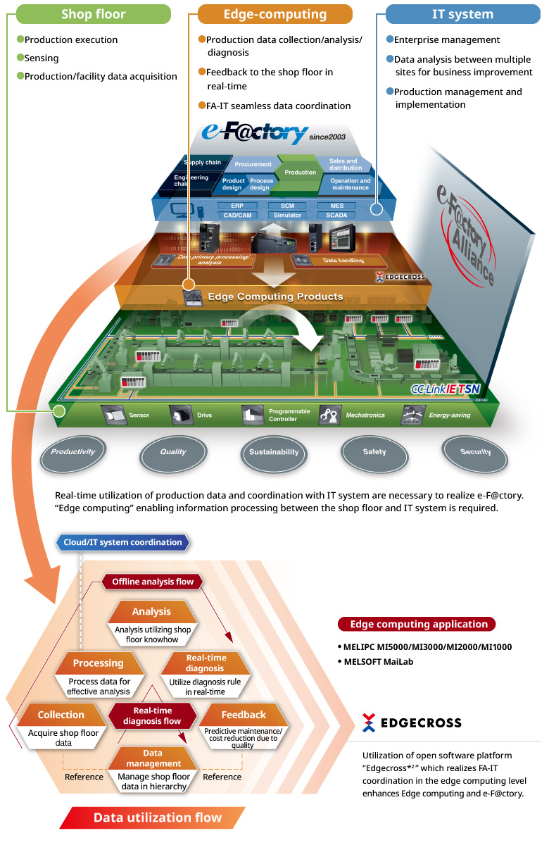 e-F@ctory เป็นโซลูชันของ Mitsubishi Electric สำหรับปรับปรุงประสิทธิภาพขององค์กรการผลิตใดๆ โดยการเพิ่มประสิทธิภาพการผลิต และลดต้นทุนการบำรุงรักษาและการดำเนินงาน พร้อมการไหลเวียนของข้อมูลที่ราบรื่นทั่วทั้งโรงงานโดยใช้การผสมผสานระหว่างระบบอัตโนมัติในโรงงานและเทคโนโลยีด้านไอที