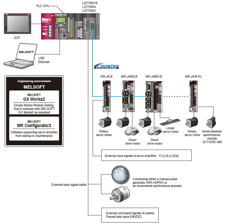 Structure an integral system consisting of the MR-J4 series servo amplifiers and servo motors with the PLC CPU module and SSCNETIII/H integrated.