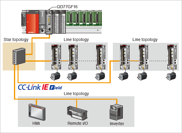 Line, star, and line/star mixed topologies are available for the CC-Link IE Field Network wiring layout.