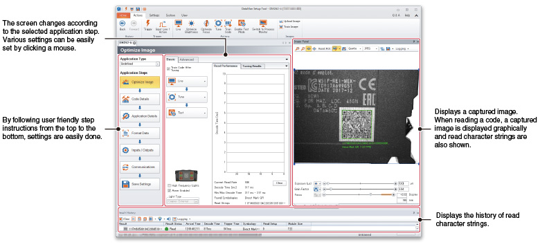 Application settings are easily done with DataMan Setup Tool for MELSENSOR Code Reader just by setting each process such as code reader connection, adjustment, reading test in the order of the left navigation.