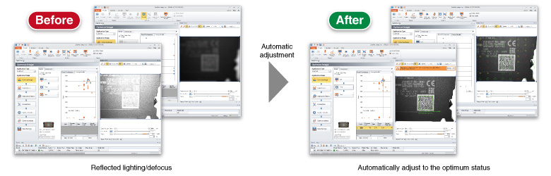 Auto-tuning function enables automatic focusing and lighting adjustment. Optimum setup according to the environment is easily done just by pressing a button on the code reader. Even novice users can make settings easily.