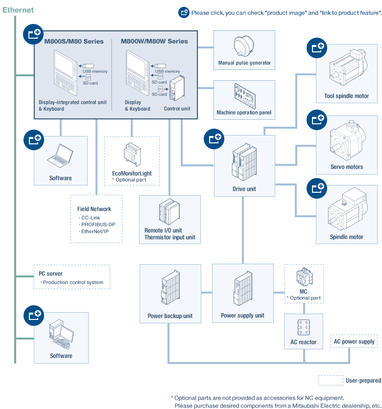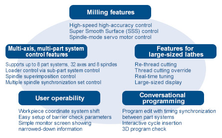 Milling features have been enhanced through high-speed high-accuracy control, SSS control and inclined surface machining command. Multi-axis, multi-part system control features have also been upgraded. A wide array of these features help ensure high productivity.