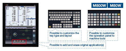 The display shows the standard CNC screen on the upper half, while offering the lower half (home application) to be freely customized. It is also possible to add some originality to machines to increase their added value. However, it is difficult to design the whole screen at the same time. This screen layout can satisfy such needs.