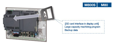 The panel-in type CNC with integrated display has the SD card interface on the back of the display. By installing an SD memory card, large-capacity machining programs can be stored.