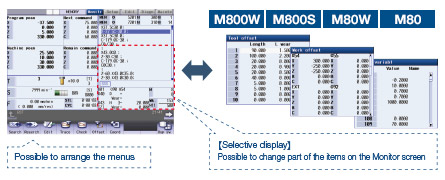 Each operator has their own set of frequently used menus. This CNC allows operators to rearrange their menus and hide any unused ones so they can easily navigate to their desired screen. This CNC has a function called Selective Display, which enables partial customization of the Monitor screen. Selectable Display allows you to constantly display tool offsets, common variables, or a custom screen made by a machine builder.