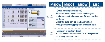 A wide range of setting items such as tool name and tool ID are readily available. You can read or write tool data or add custom data via ladder or machining program.