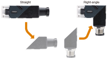 The configuration can be changed between in-line and right-angle. By changing the configuration according to the installation space, the code reader can be installed by the wall or in tight spaces where wiring orientation is constrained.