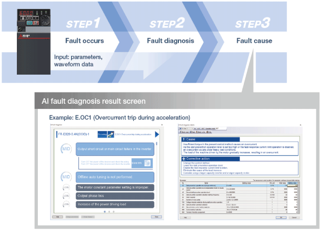 Maisart*2 (Mitsubishi Electric's AI technology) is integrated in the software to analyze data and help identify the cause of a fault*3 (this function is enabled during speed control).