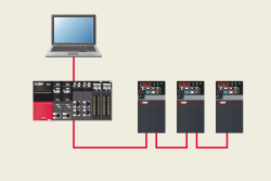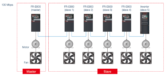 Communication between multiple inverters is carried out through the I/O device and special register transmission of the PLC function. A small-scale system can be created by connecting multiple inverters via Ethernet. (The FR-A800-E inverter or the FR-F800-E inverter can be mixed in the system.)