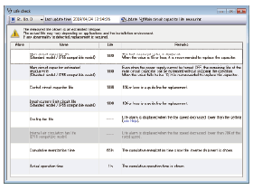 Parts service life data is displayed in a dedicated window. A warning icon is shown in the alarm field of the parts recommended for replacement.