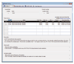 Fault records in the inverter can be displayed. When the clock function or CC-Link IE TSN communication is used, the time of fault occurrence can be displayed, too. It is possible to check the occurrence time and the type of faults, which is helpful in identifying causes of faults.