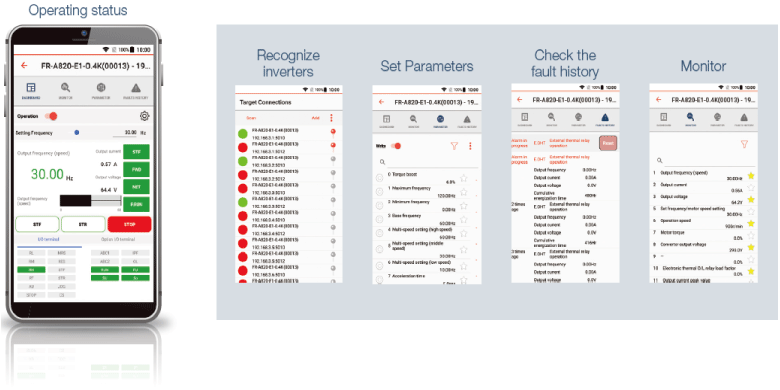 Wireless access with inverters from a remote location enables setting or changing of parameters, starting and stopping, and monitoring on the screen of mobile devices.