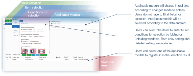 Advanced search for optimum inverters is available. Users can select inverters by entering data such as the motor capacity and current value and specifying specifications. The time spent on inverter selection can be reduced.