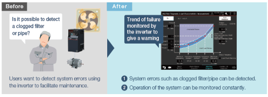 By storing the data of relationship between the output frequency and the torque during normal inverter operation, users can judge whether the load is operating in normal condition. By outputting out-of-range warnings if applicable, users can detect mechanical faults or perform maintenance.