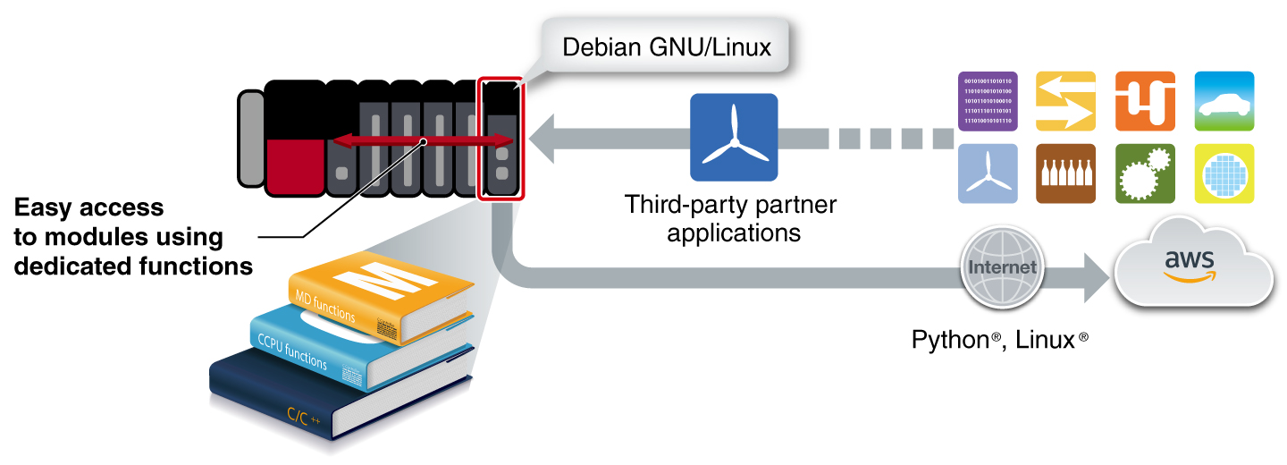 C Controller dedicated functions (CCPU functions) and MELSEC communication functions (MD functions) realize easy access to the C Controller, I/O, intelligent function, network, and programmable controller/motion CPU modules. Applications involving programmable controllers can be easily created using these functions.
