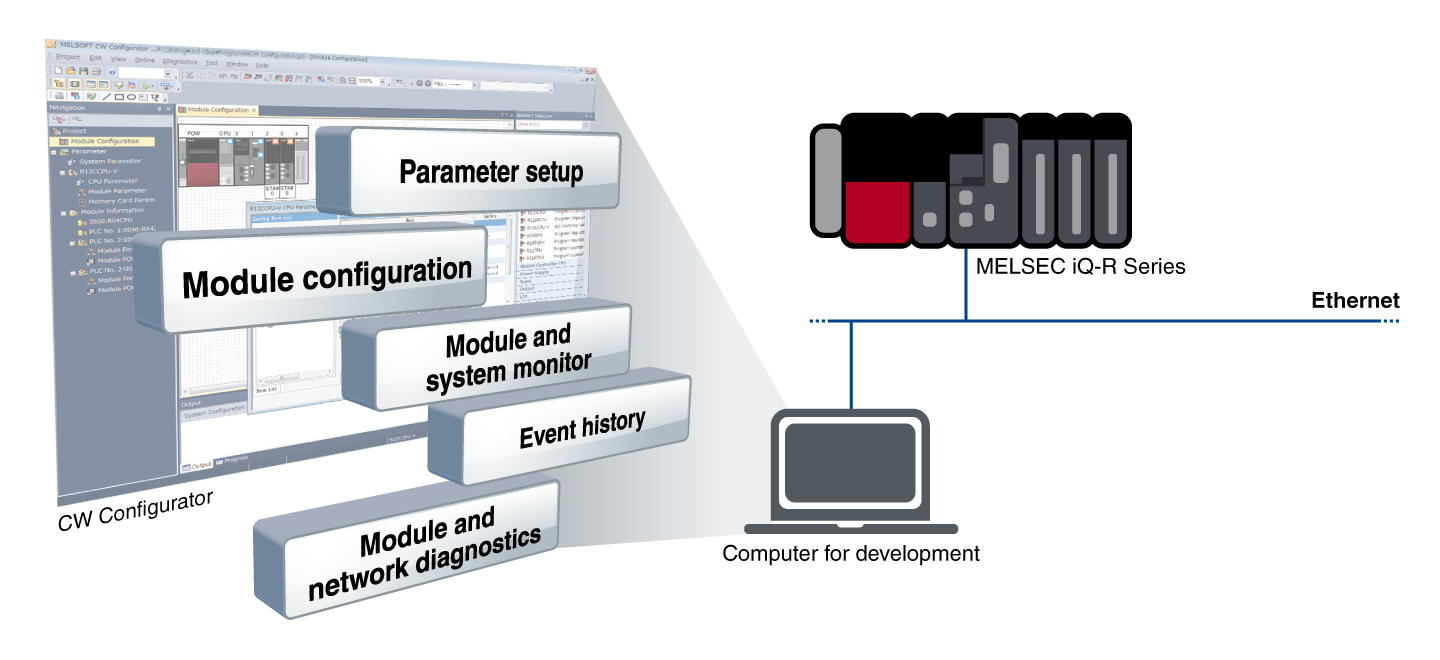 CW Configurator enables parameter setup, module diagnosis and monitoring of various MELSEC iQ-R/Q Series intelligent, network and I/O modules*1 including the C Controller module. Using CW Configurator is as easy as using the MELSEC iQ-R engineering software GX Works3, which shares similar interfaces.