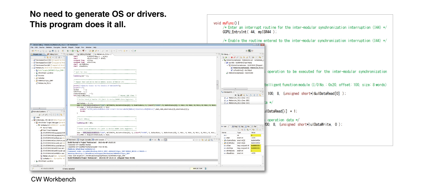 Developing applications with the MELSEC C Controller is easy as no additional driver development is required, whilst providing a full-scale embedded development environment at a relatively low cost. CW Workbench is used as the main programming software in C/C++ with a VxWorks® emulator, CW-Sim/CW-Sim standalone, which allows debugging without requiring any hardware.