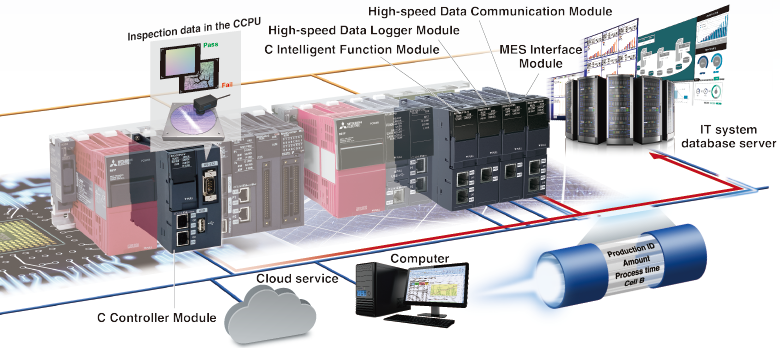 The MES interface module realizes direct access to the IT system with easy setting. Overall system cost is reduced as gateway computers are not required. The C intelligent function module supports Debian GNU/Linux, realizing third-party cloud services connection. Predictive and remote maintenance of machines are easily realized.