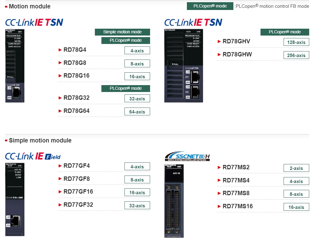 Motion module and simple motion module are easy to setup similar to the positioning module and offer high-precision motion controller performance. This is an easy-to-use module specifically designed for highly precise motion control applications, available with connection to either CC-Link IE TSN, CC-Link IE Field or SSCNET Ⅲ/H networks depending on the model.