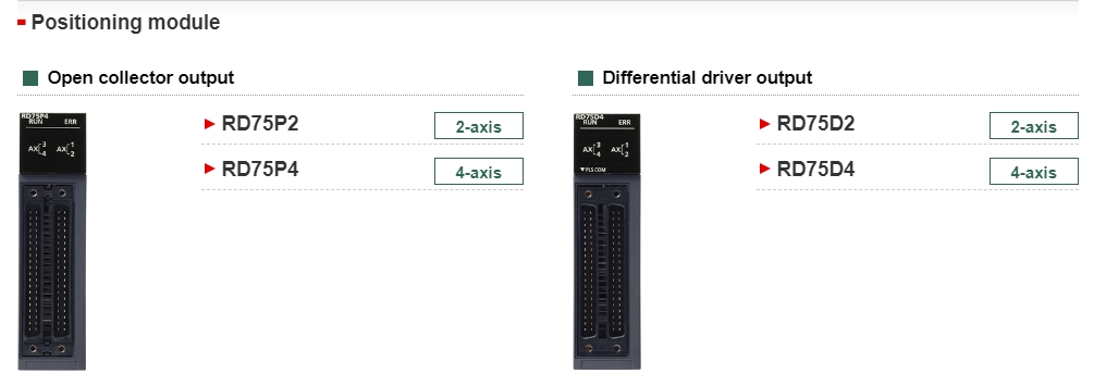 Capable of high-speed transmission (5M pulses/s*1), the positioning module can control up to four axes. This versatile module supports connection to a wide range of motion devices, such as pulse-train input servo amplifiers or stepping motor with a transistor (open collector), or differential driver input interface.