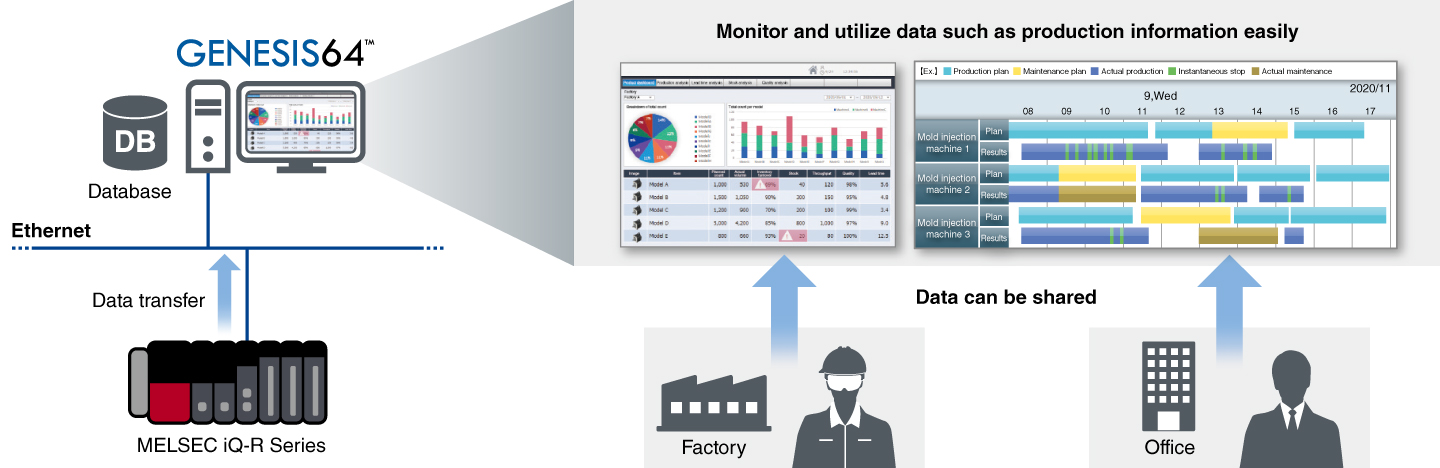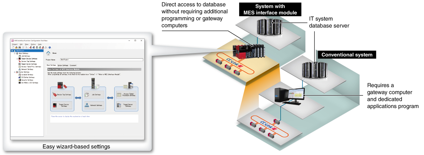 MES interface modules enable direct connectivity between IT database servers and programmable controllers on the shop floor, eliminating the need for gateway computers or specified programs. Being much more reliable than computers, the MES interface modules save on maintenance costs typical of computers.