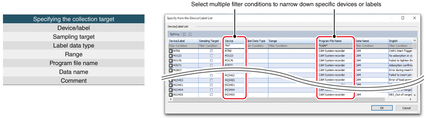 The system recorder module series are designed for logging of all device and label data before and after a trigger occurs. Influence on the CPU scan time is minimal as the execution load is separated. This can be ideal for ensuring determinism in a control system. Influence on the CPU scan time is further minimized by filtering of device and labels. Collecting targets can be quickly selected by narrowing down with multiple filter conditions.