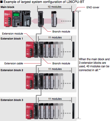 | L02SCPU(-P) L02CPU(-P) | Up to 2 blocks | Main block: 10 modules Extension block: 11 modules |