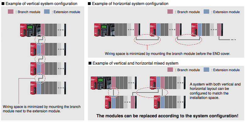 Up to three extension blocks connectable to the main block using branch and extension modules. A maximum of 40 modules*1 caters a wide range of production equipment and line scale.