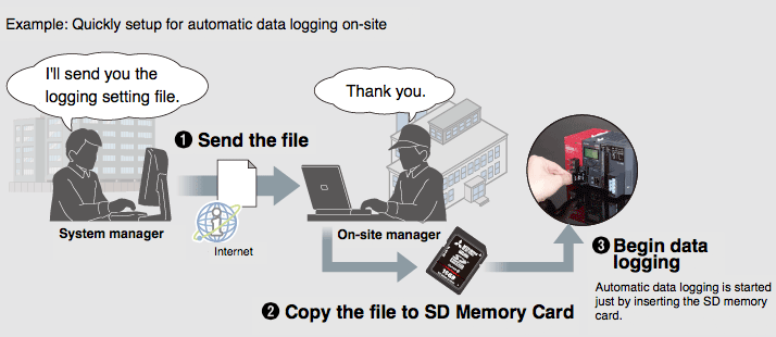 Automatic data logging realized just by inserting the SD memory card into the CPU, which is achieved as the memory card includes the logging configuration file. Instructing data logging remotely is also realized just by sending the configuration file by e-mail and copying onto the SD memory card.