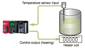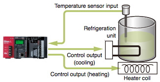 | ■ Example: Standard control (heating only) The temperature of the object is controlled by adjusting the heater output based on the PID calculations resulting from the temperature sensor input. | ■ Example: Heating-cooling control (heating and cooling elements controlled simultaneously) Heating is performed when the control object's temperature is lower than the target temperature, and cooling is performed when it is hotter or the humidity needs to be reduced. |