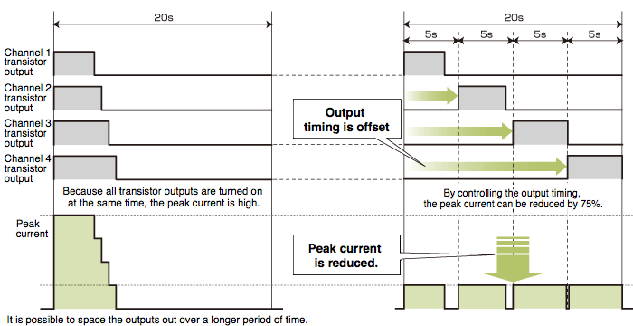 The peak current control function reduces the peak current by automatically changing the upper-output limit value for each channel, while dividing the transistor output timing*1.