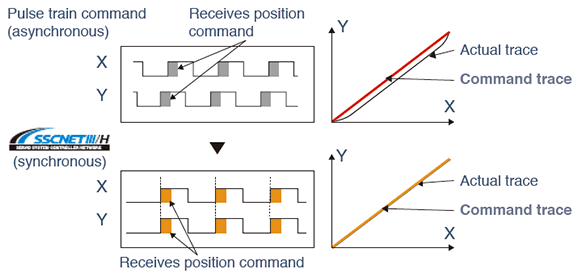 Complete deterministic and synchronized communication is achieved with SSCNETIII/H, offering technical advantages in machines such as printing and food processing machines that require synchronous accuracy.