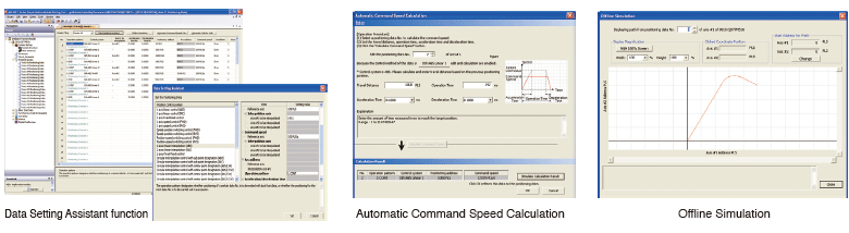 - Positioning data can be set very simply by using functions such as Automatic Command Speed Calculation, Offline Simulation, and automatic calculation of auxiliary arc, etc.