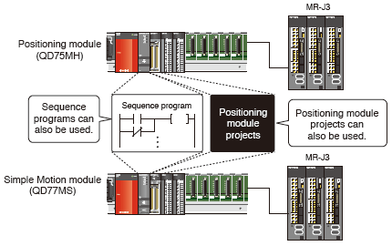 The Positioning module (QD75MH) projects and sequence programs are easily diverted to the Simple Motion module (QD77MS/LD77MS).