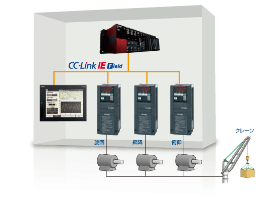 Wiring is reduced by connecting multiple inverters via CC-Link IE Field Network. Also, the monitor can be enhanced.