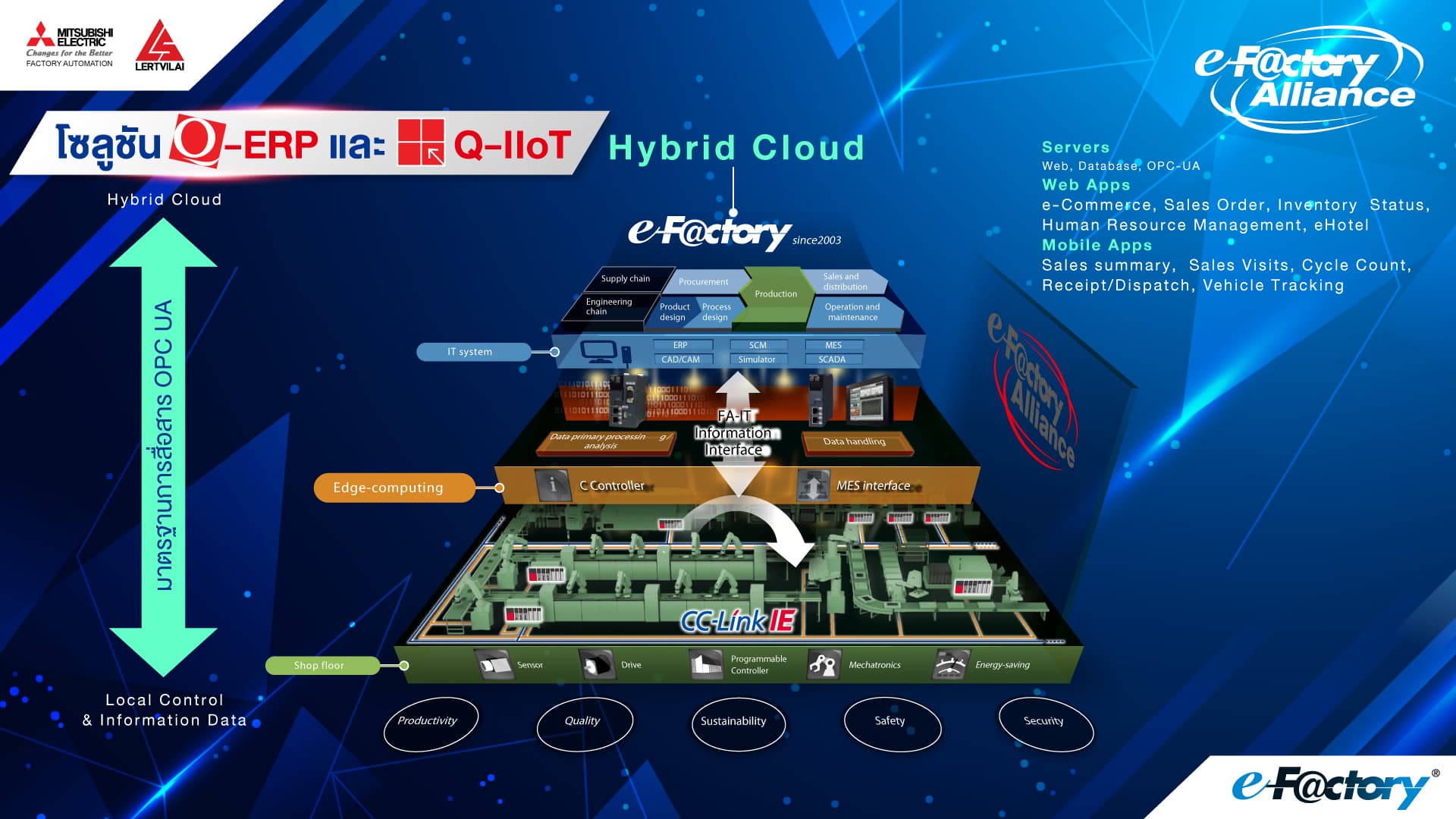 ในยุคที่การทำงานส่วนใหญ่ขึ้นอยู่กับ Data เพื่อใช้ในการวิเคราะห์ข้อมูลและแก้ไขปัญหาได้อย่างตรงจุด รวมถึงความสะดวกในการควบคุม เพื่อให้การทำงานมีความราบรื่นและตอบสนองได้ทันกับทุกเหตุการณ์ Mitsubishi Electric ได้พัฒนาโซลูชันร่วมกับบริษัทในเครือข่ายพันธมิตร e-F@ctory alliance นั่นคือ บริษัท เลิศวิลัยแอนด์ซันส์ จำกัด ซึ่งเป็นผู้นำด้านการพัฒนาและออกแบบระบบหุ่นยนต์อัตโนมัติในประเทศไทยจำกัด พัฒนาร่วมกับ Mitsubishi Electric เป็น 2 โซลูชันที่มีสำคัญอย่างมากต่อการช่วยพัฒนาและยกระดับมาตรฐานการกระบวนการผลิตของภาคอุตสาหกรรมในประเทศไทย ได้แก่ Q-ERP และ Q-IIoT